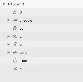 When you export an Artboard as SVG, the layer names get converted to id names inside the SVG. Since we want to animate some paths, it is better to know which path represents which character(s). Right now all layers are named “Fill XX” which doesn’t help much. So let’s give all of them a name, that describes their content and also change the order.