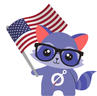 a digital drawing in a vibrant, cartoonish style, it features a cute, anthropomorphic cat with large, round eyes and a small, black nose, the cat's fur is predominantly blue with pink inner ears, and it has two small, striped stripes on its back, it is wearing large, black-rimmed glasses, giving it a playful and endearing appearance, in the foreground, there is a small white circle with a red and white pattern, possibly a symbol or a symbol, holding a flag with a white pole, the flag is american flag, with red and blue horizontal stripes and white stars, the background is completely black, making the cat and flag stand out prominently, the overall color palette is bright and cheerful, with the flag and cat drawing the viewer's attention, the drawing is clean and polished, with a clean lines and vibrant colors, typical of modern digital art, the image conveys a sense of freedom and joy, with no additional objects or people present, emphasizing the character and flag