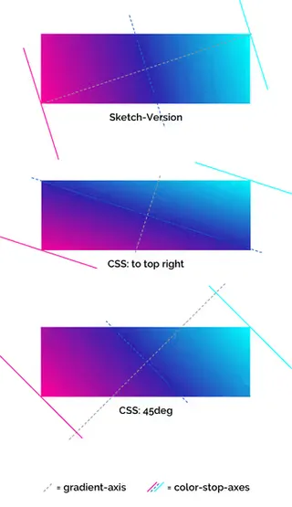 Finally, in the 45deg version, we have an angle of (surprise) 45 degrees. If you wanted to reproduce this gradient in Sketch, you need to place the gradient's endpoints at the intersections of gradient-axis and color-stop-axis. This only works as long as you do not resize the object again.