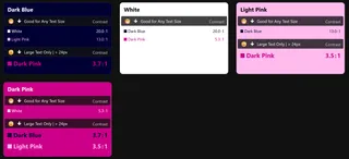Im Fokus stehen die Color Cards, die je eine Farbe eurer Palette darstellen und zeigen, wie der Kontrast mit den anderen Farben ausfällt. Links seht ihr den Namen der Vergleichsfarbe, rechts den berechneten Kontrastwert.